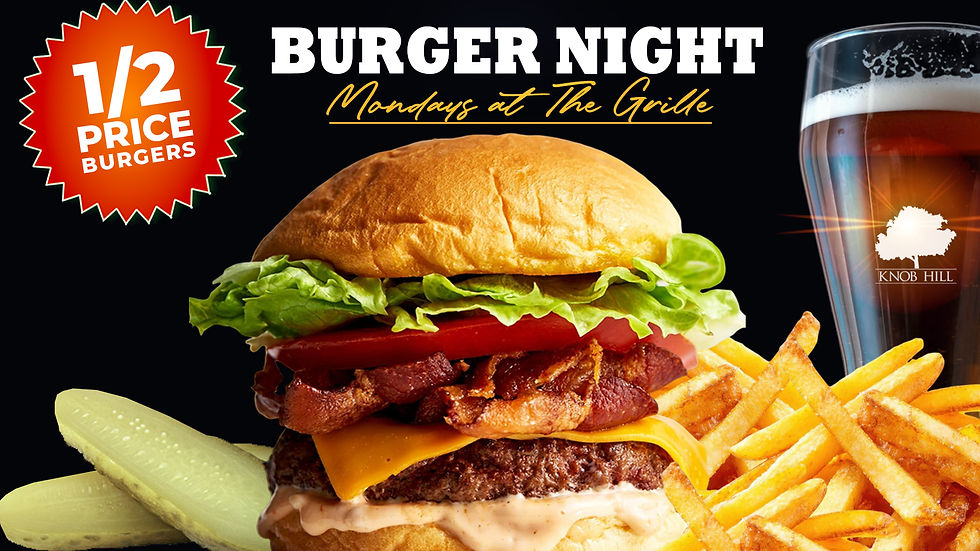 1/2 Price Burger Night Mondays at The Sycamore Grille at Knob Hill - Open to the public.